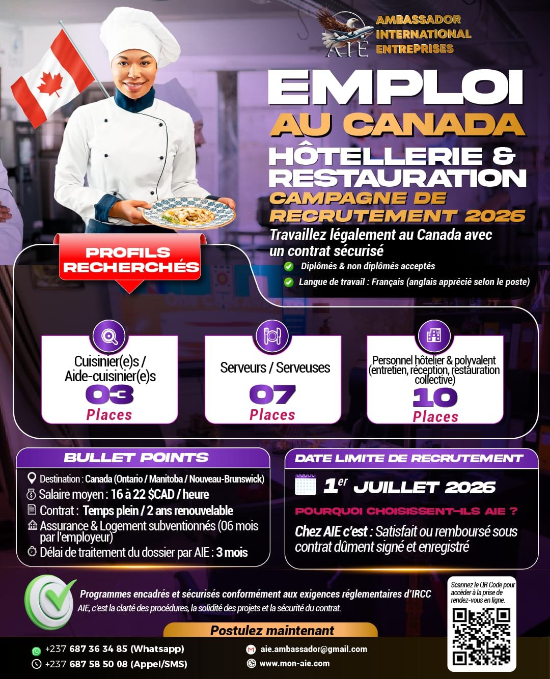 Travaillez légalement au Canada avec un contrat sécurisé AIE. Salaires 16-30$/h, logement subventionné, programmes IRCC.